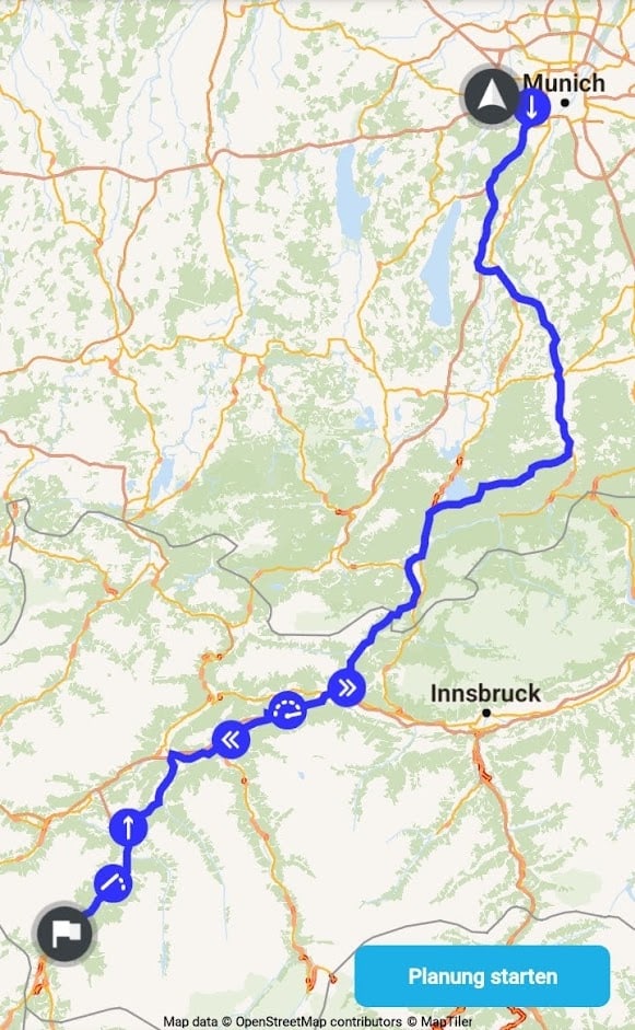 Und Abfahrt nun endlich richtung München solange es geht bis der Tank fast leer ist.