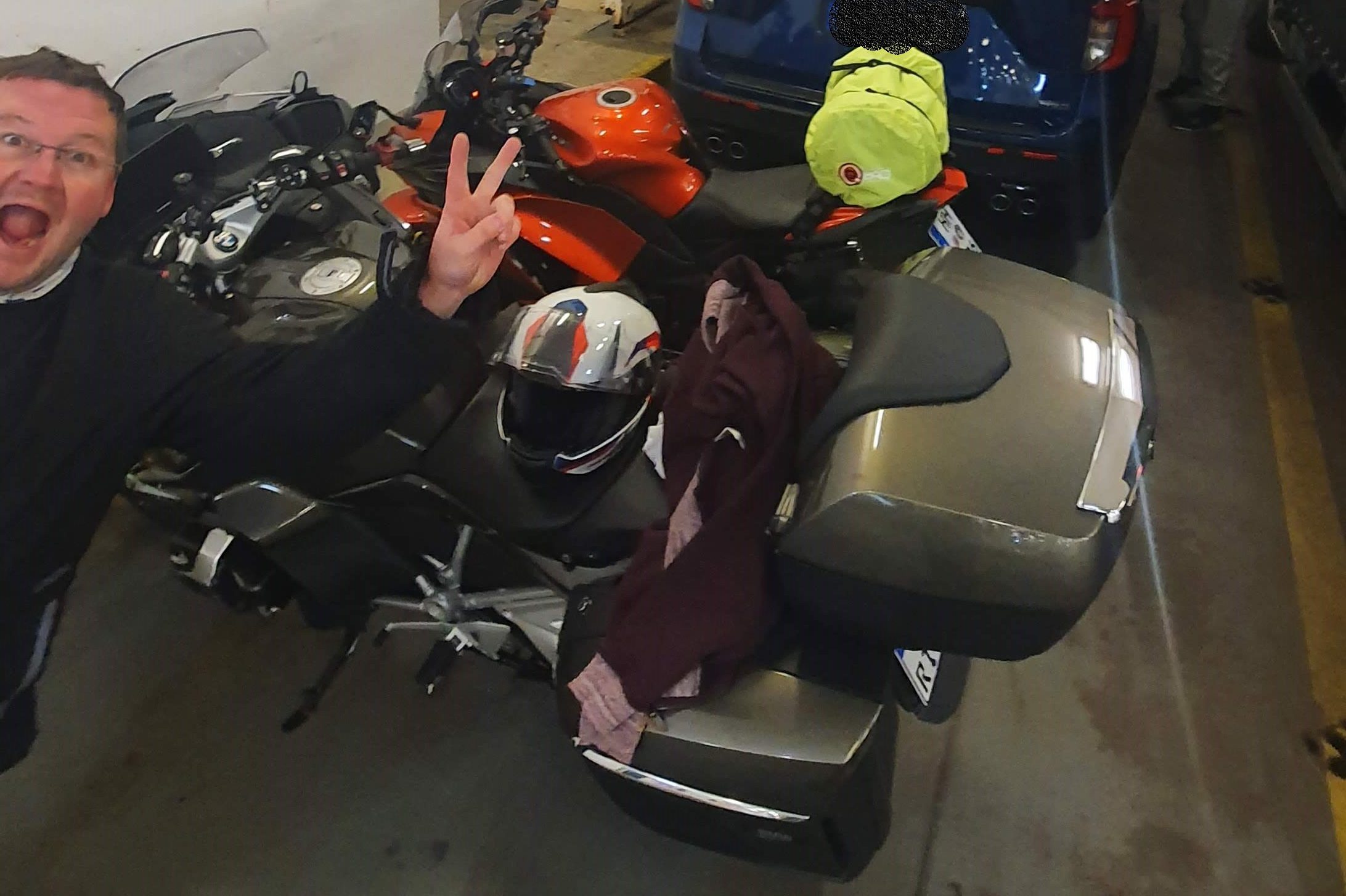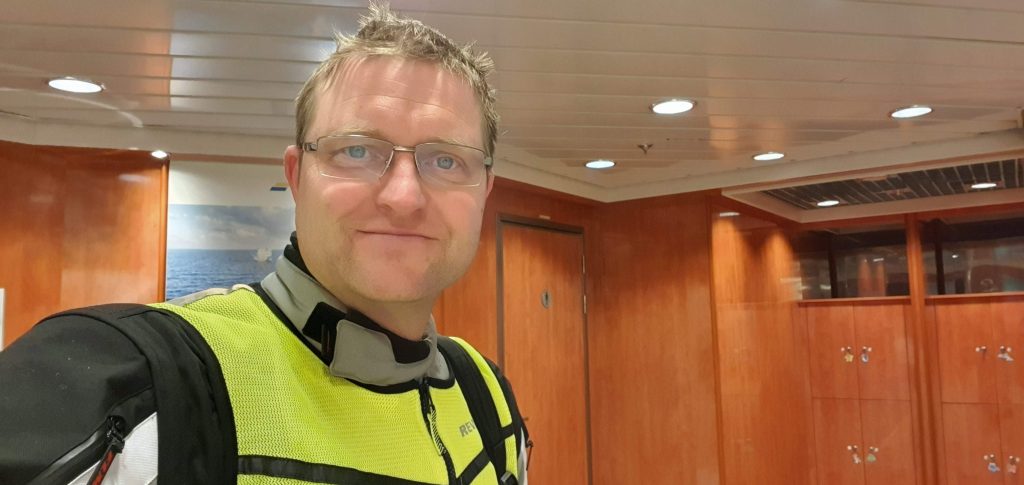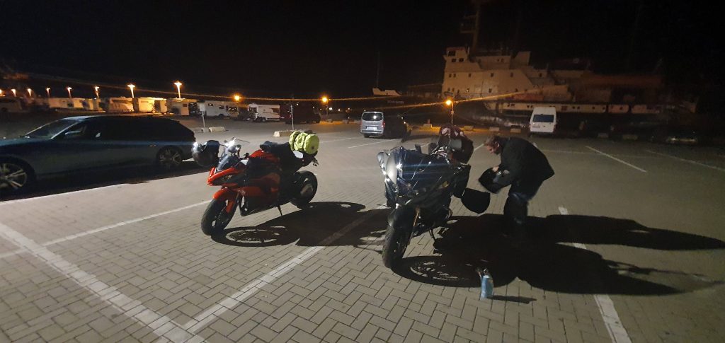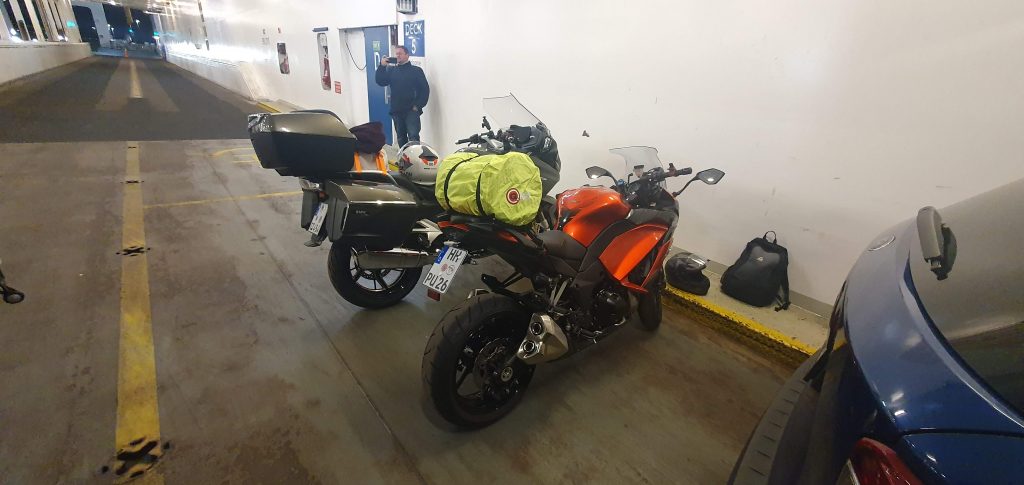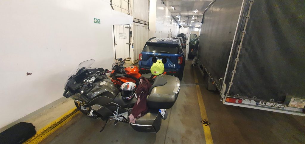 Jedoch sollten wir bei unsere Überfahrt eines besseren belehrt werden und wir wurden einfach quer hinter die Autos gestellt und sollten nichts verzurren nach Aussage des Fährpersonals. Ganz zu schweigen davon das dies an unser Position auch gar nicht möglich gewesen wäre da es hier keine Ösen oder naheliegenden Möglichkeiten am Boden gab zum verankern. Wir stellten also die Bikes ab befestigten die Parkbremsen und machten die Bikes so Standfest wie möglich, schnappten uns unsere Sachen und gingen an Board. Dabei mussten wir uns Mut zu sprechen weil wir nichts verzurren konnten/sollten, das es sicher eine ruhige Überfahrt wird und die Vorhersage so ist und darum darauf verzichtet wurde.