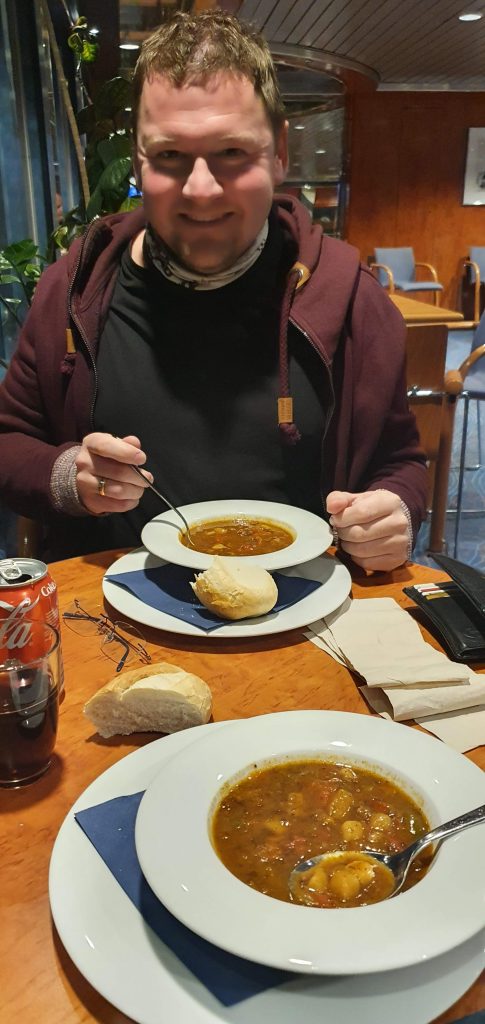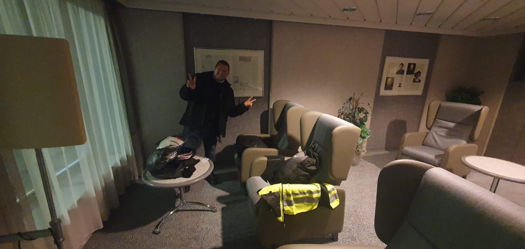 Für die Überfahrt hatten wir die Nachttour gebucht (Abfahrt 23:30Uhr) und weil Daniel bereits den ganzen Tag gefahren war hatten wir uns auf der Fähre zwar gegen eine Kabine dafür aber für die vorhandenen Schlafsessel entschieden in einem seperatem Raum. Diese müssen vorab gegen extra Geld gebucht werden.