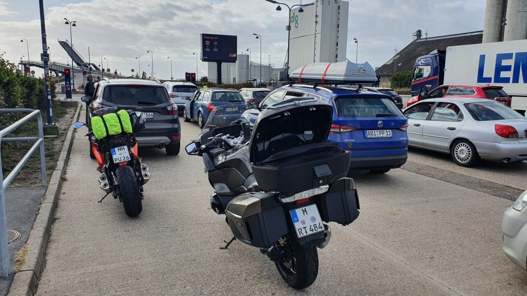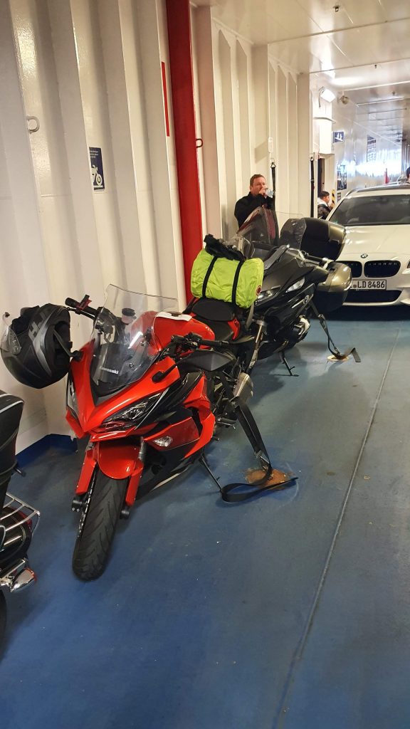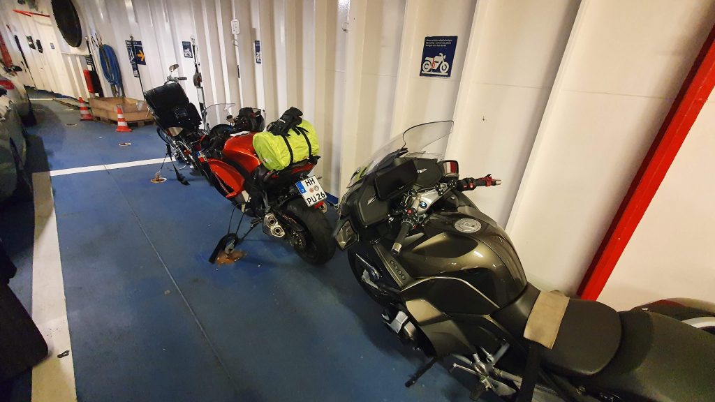 Um kurz vor drei erreichten wir dann Rodby um mit der Fähre Richtung Puttgarden über zu setzten. Die Tickets hierfür hatten wir bei der Pause in Kopenhagen beim Tankstop online gebucht da wir dort abschätzen konnten wann wir ungefähr dort sein werden. Und nach einer Kurzen Zeit in der Wartespur kamen wir zügig aufs Schiff zusammen mit einer weiteren schwedischen Harley. Nicht so wie bei TT-Line auf der Hintour gab es anbord der Scandlinesschiffe extra Bereiche für die Bikes wo diese dann auch gesichert werden mussten. Das war Gott sei dank ein Kinderspiel und nicht schwer und so konnte die 45 min Überfahrt dann Starten.